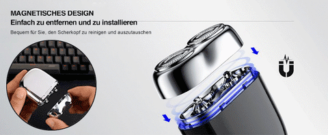 Der Elektrorasierer besteht aus einer Volllegierung mit sanft abgerundeten Konturen, die dem Rasierer ein elegantes Aussehen verleihen. Die glatte Form sorgt für ein gutes Gefühl. Der Elektrorasierer für Männer hat einen Rasierkopf mit magnetischem Design, ist leicht zu zerlegen und flexibel zu installieren und erleichtert Ihnen die Reinigung und den Austausch des Kopfes.